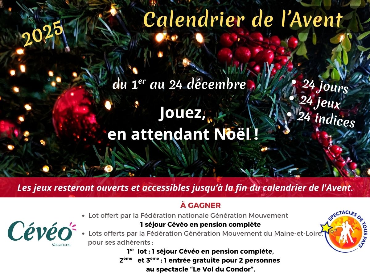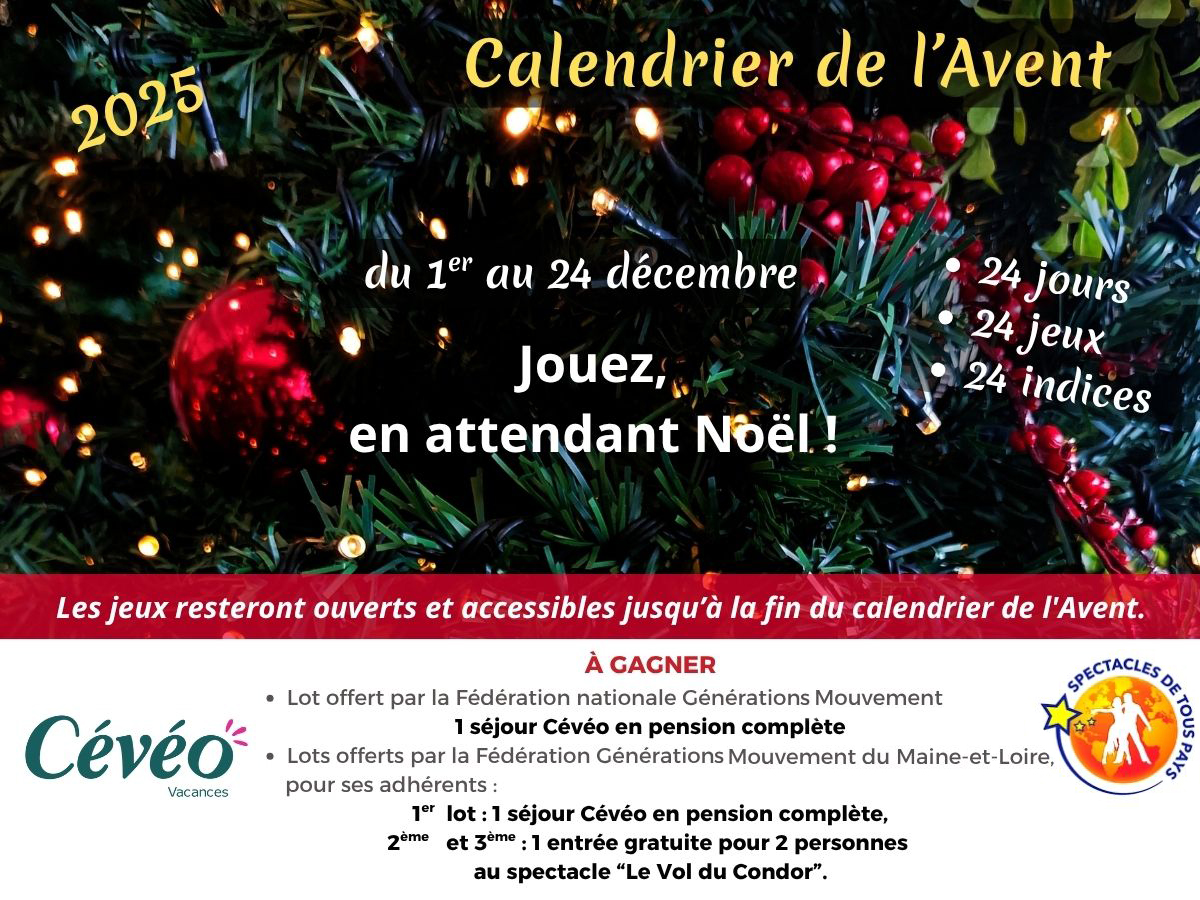 La Fédération Générations Mouvement du Maine-et-Loire propose cette année, son calendrier de l’Avent à tous les adhérents de notre Mouvement et invite toutes les Fédérations à relayer l’information.